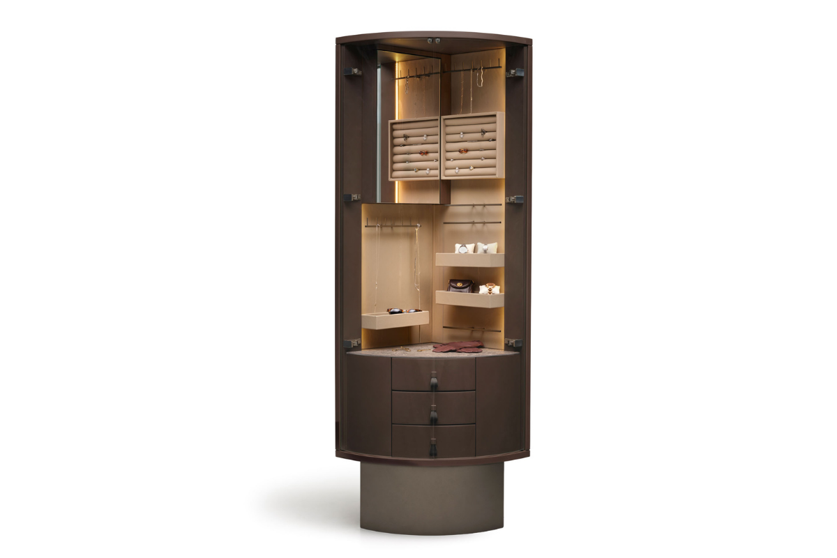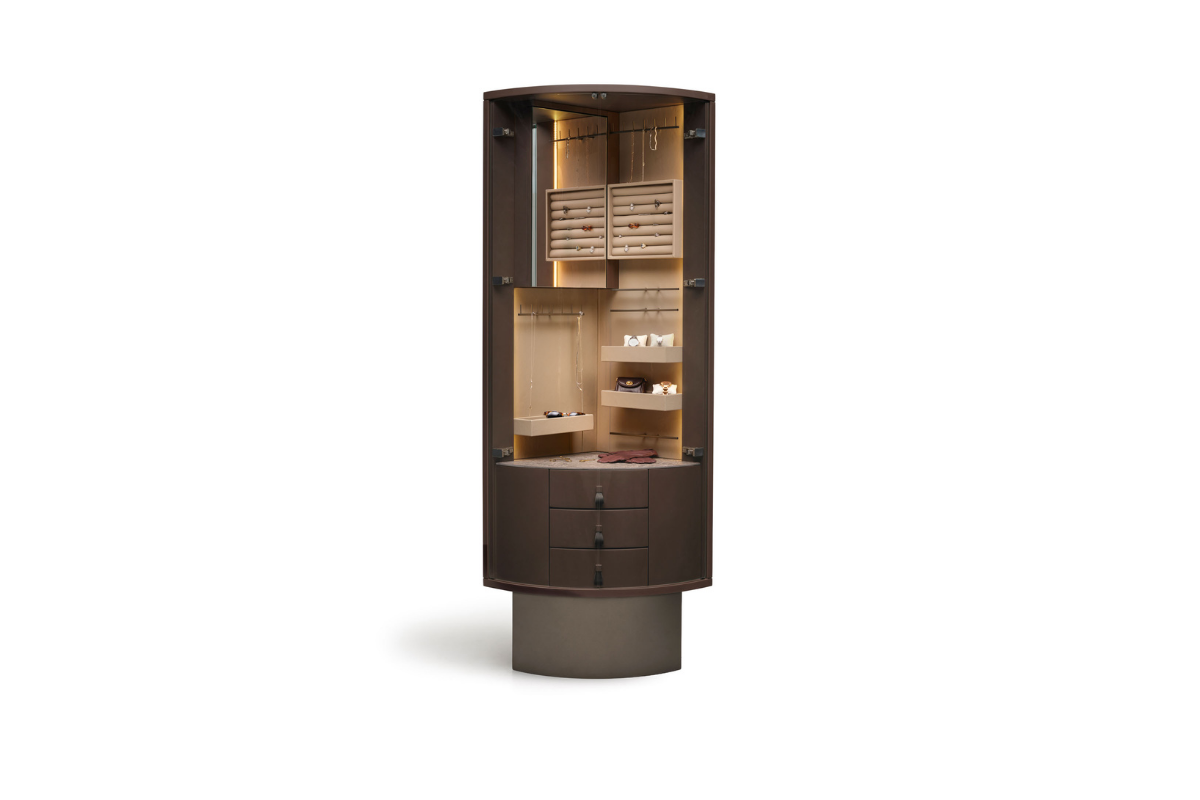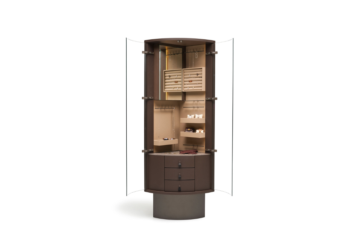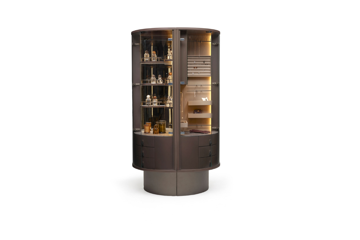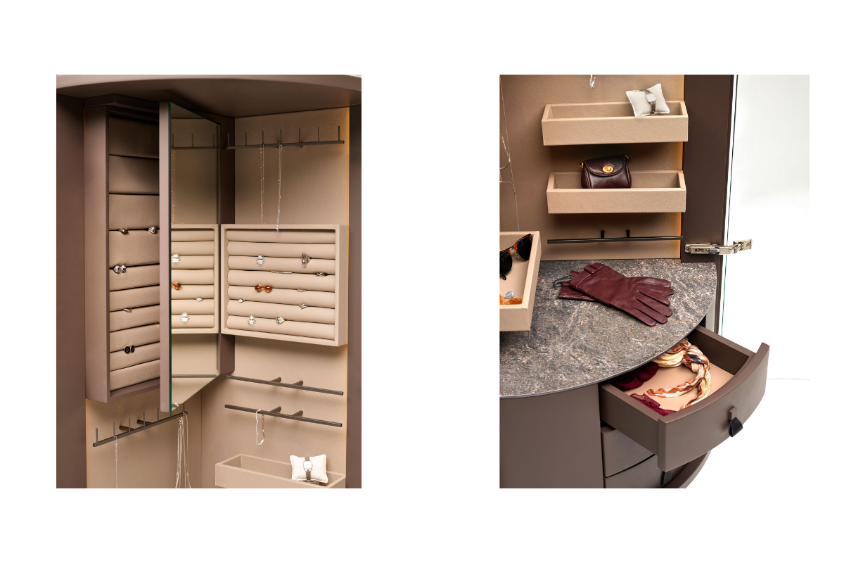 Configurable as a half-circle through the combination of two modules, PRIVA offers organized dual use: one side stores jewelry and accessories, while the other is dedicated to perfumes and makeup products. The PRIVA jewelry cabinet includes a private compartment accessed via a mirrored door with a fingerprint reader. Metal hangers support jewelry organization, while cushioned box shelves
